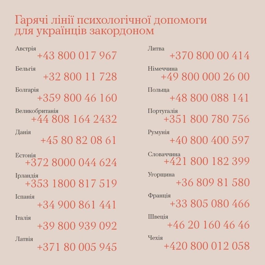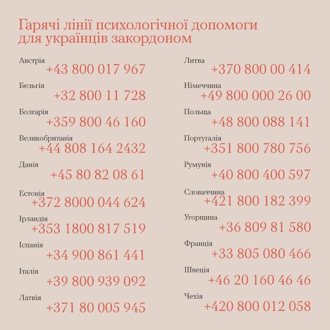 Зберігайте закордонні гарячі лінії психологічної допомоги українцям. За ними вас з’єднають з фахівцями, які надають кризові (і не тільки) консультації, а також можуть спрямувати до інших спеціалістів за необхідності.