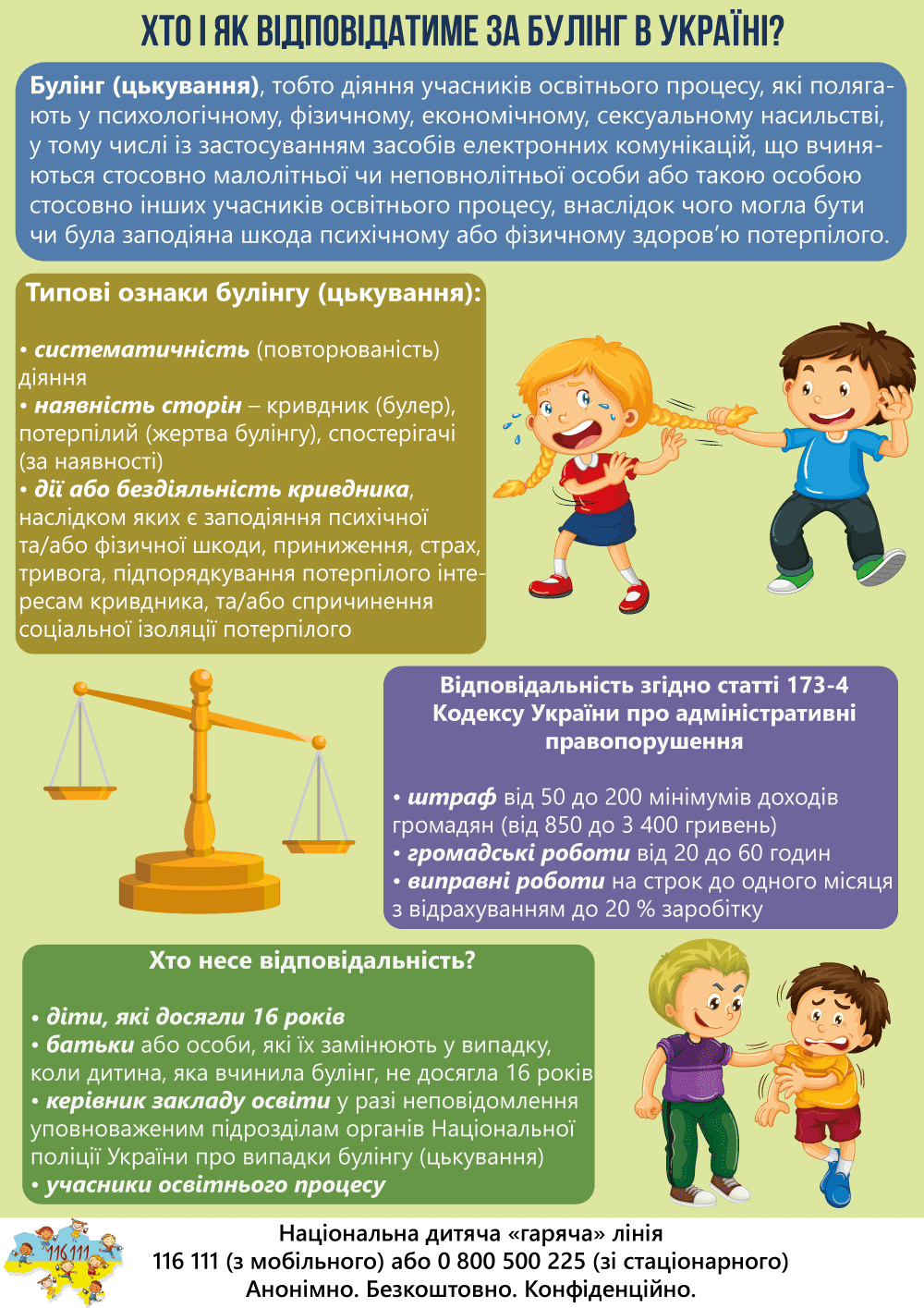Кривдників від 16 років чекатиме адміністративна відповідальність у вигляді штрафу або громадських робіт. А от у випадках, коли булінг вчинила дитина, яка не досягла 16 років, відповідальність будуть нести її батьки або інші законні представники.