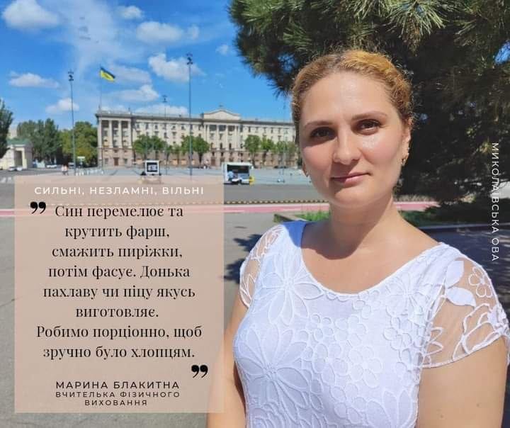 ????«Син перемелює м’ясо, крутить фарш, сам смажить пиріжки, потім фасує. Донька пахлаву чи піцу якусь виготовляє. Робимо порціонно, щоб зручно було хлопцям брати, бо немає коли засиджуватися та їсти», – розповідає вчителька.