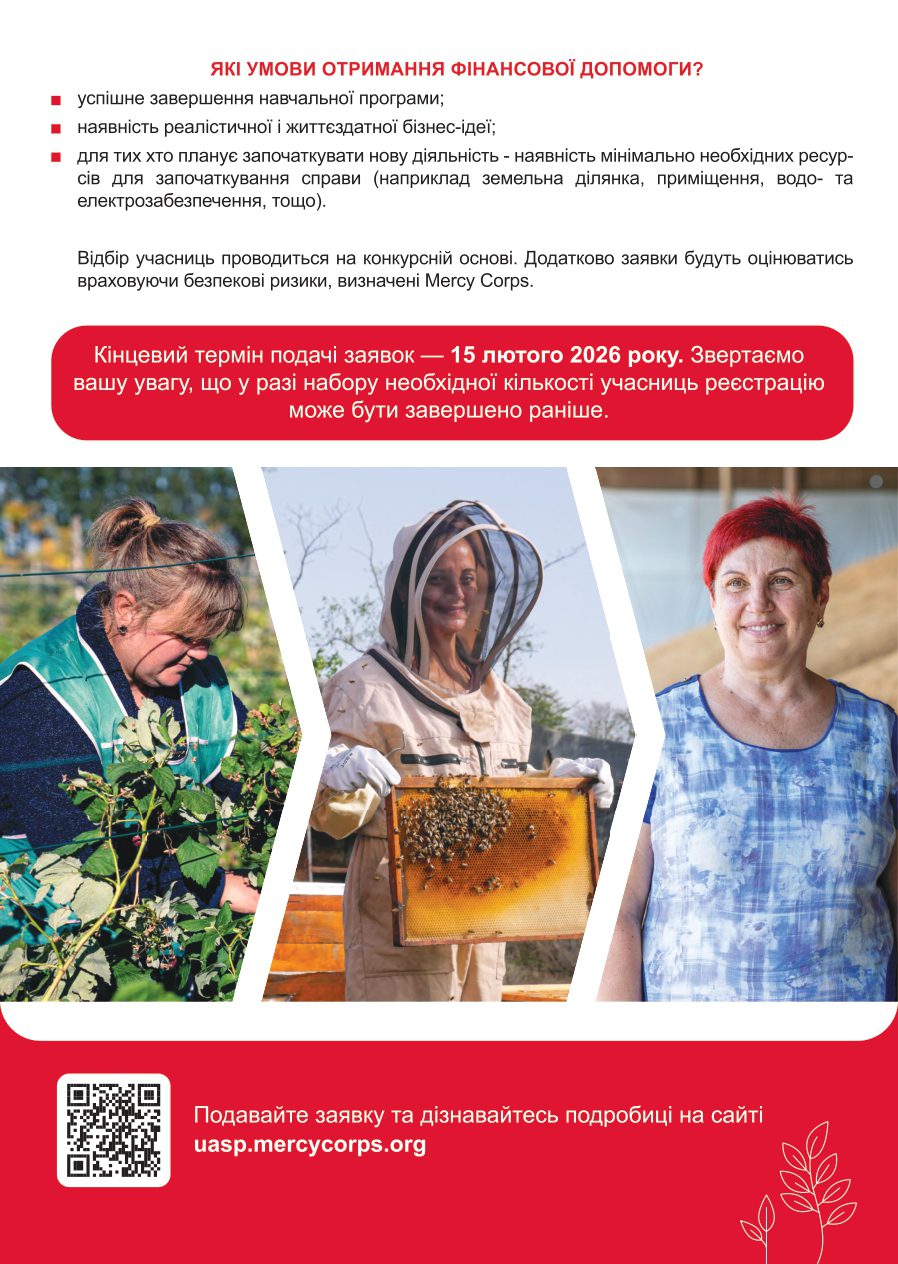 Для учасниць, які отримають фінансування, програма передбачає подальшу підтримку у вигляді менторського супроводу від експертів у сфері сільського господарства.