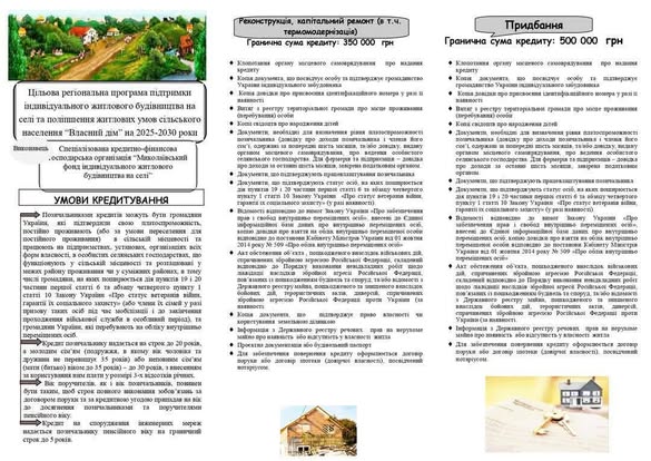 Бажаючих отримати кредит, просимо звертатись за консультацією до СКФГО «Миколаївський обласний фонд підтримки індивідуального житлового будівництва на селі» (адреса: м. Миколаїв, вул. Робоча 2-А, оф. 508, тел. 0673681365, (0512) 56-34-22, e-mail: skfgo.mk@ukr.net.