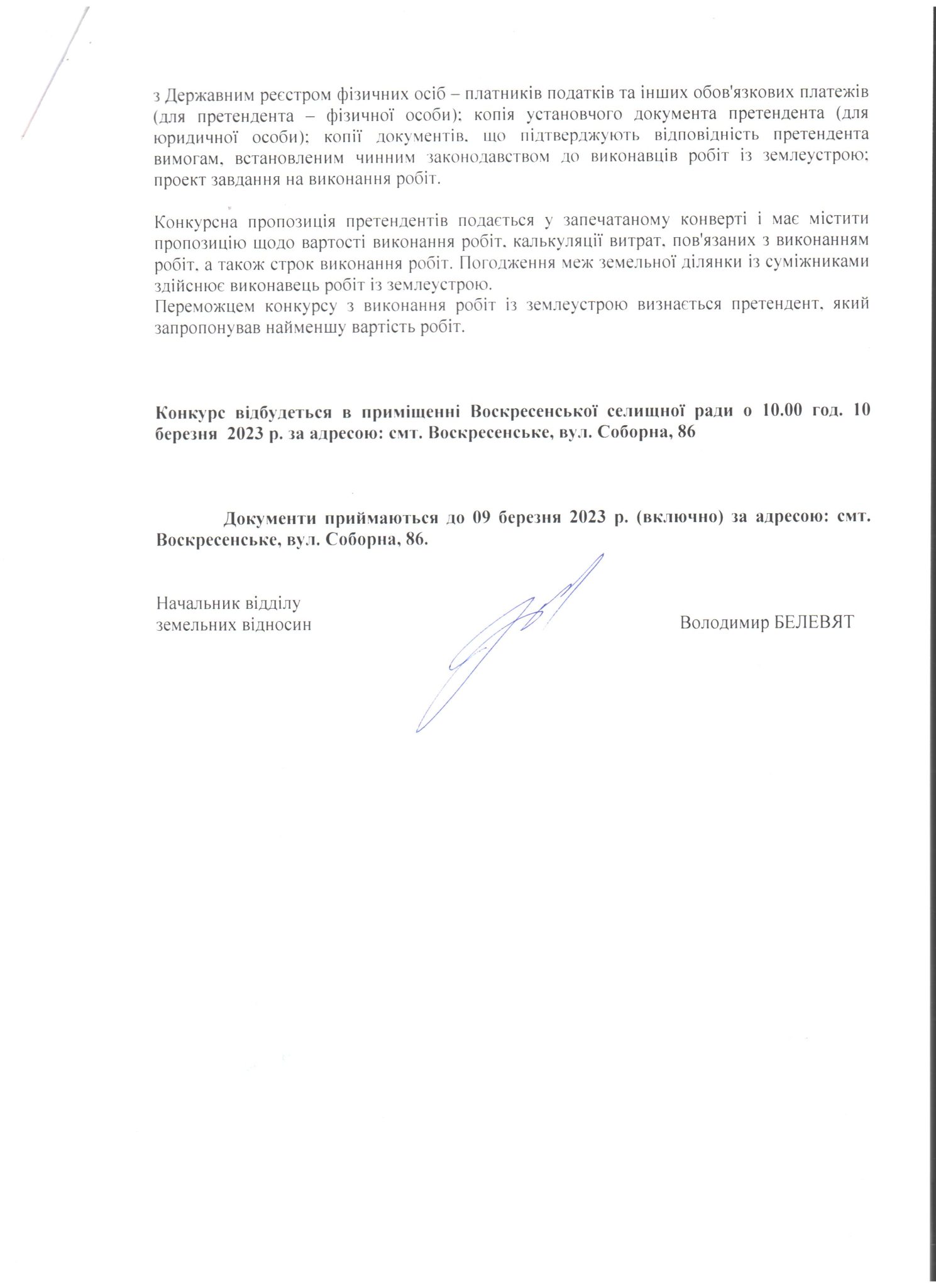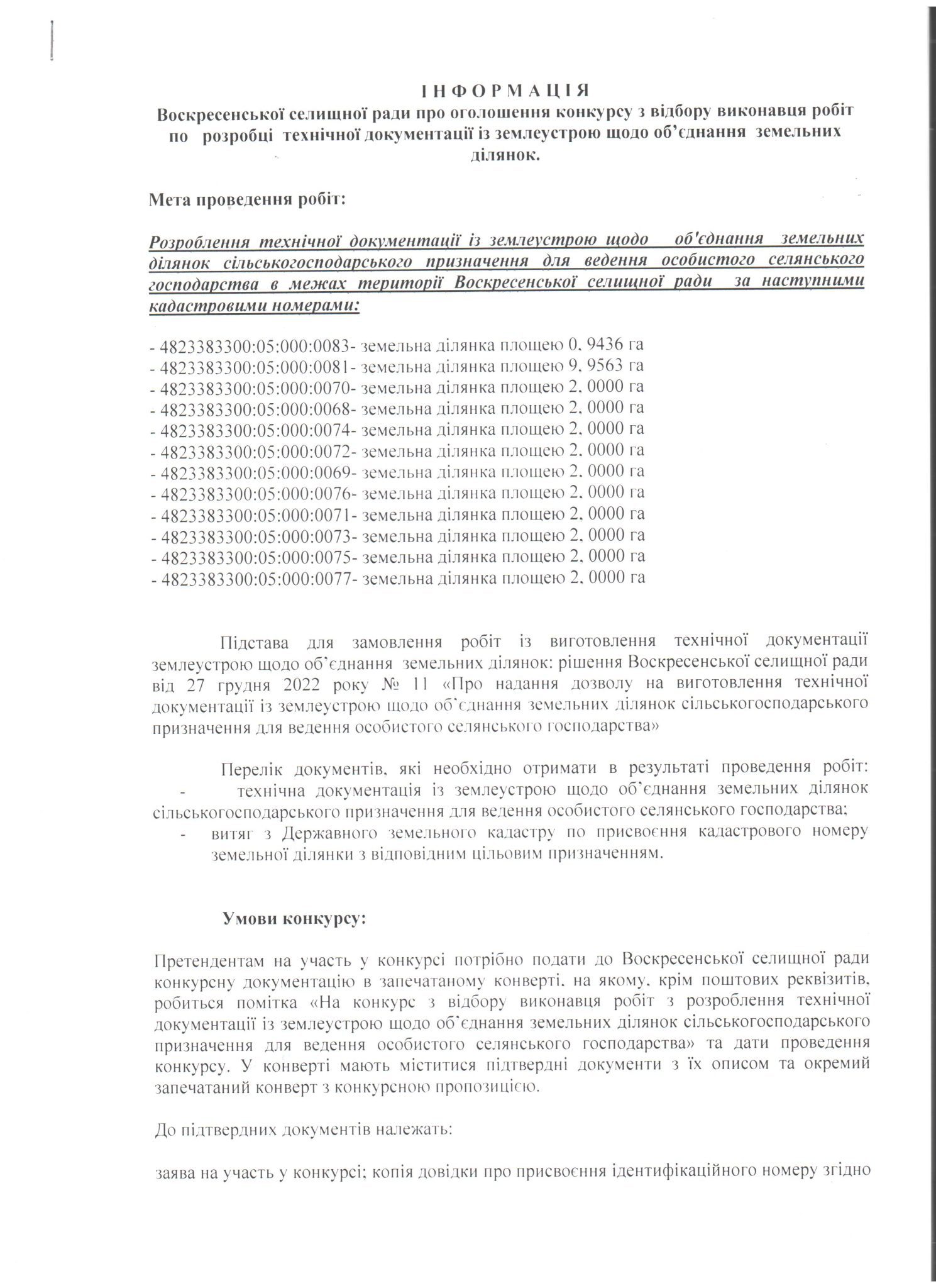 Оголошення конкурсу з відбору виконавця робіт по розробці технічної документації із землеустрою щодо об’єднання земельних ділянок