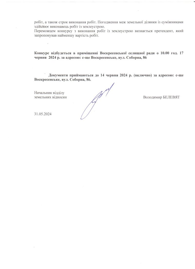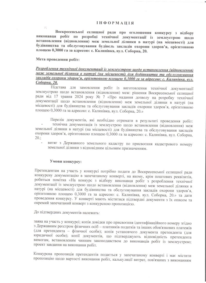 Оголошення конкурсу з відбору виконавця робіт по розробці технічної документації із землеустрою щодо встановлення (відновлення) меж земельної ділянки в натурі (на місцевості) для будівництва та обслуговування будівель закладів охорони здоров’я, орієнтовною площею 0,3000 га за адресою: с.Калинівка, вул.Соборна, 20