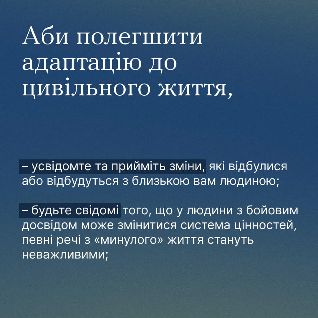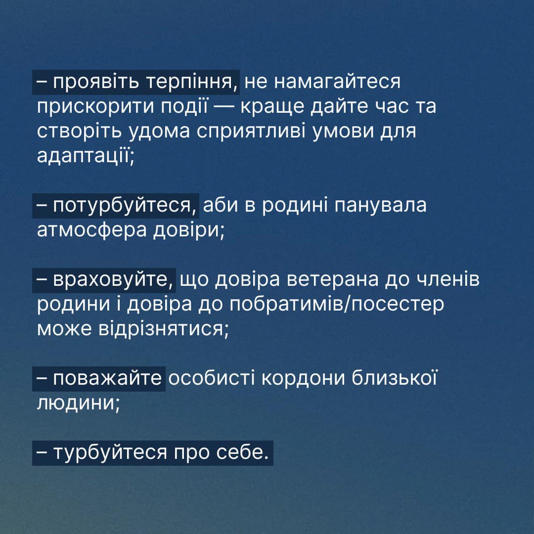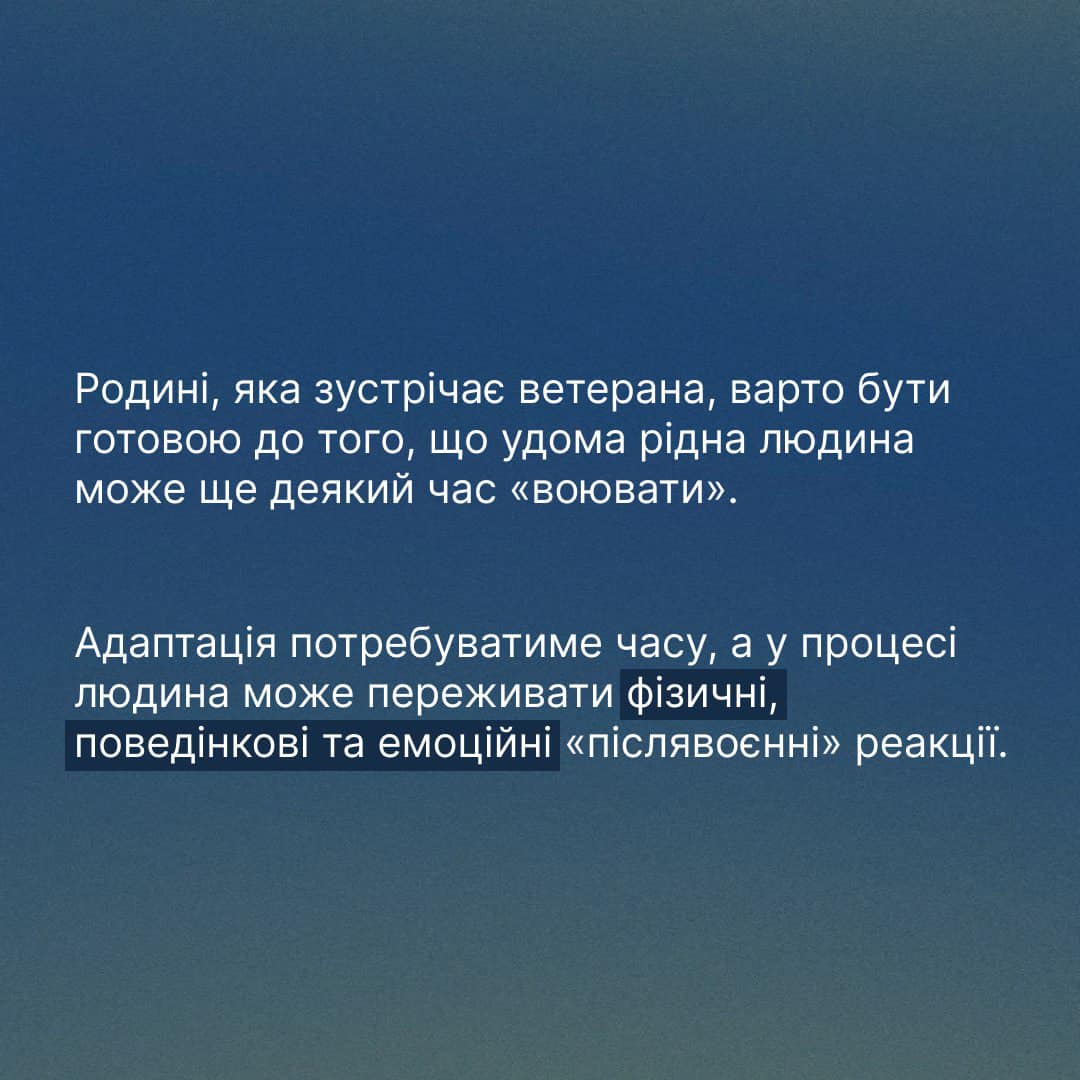 Родині, яка чекає маму чи тата, сина, дочку або ж брата з війни, варто бути готовою до того, що вони можуть повернутися «іншими». Що рідна людина ще деякий час «воюватиме» і потребуватиме нашого терпіння.