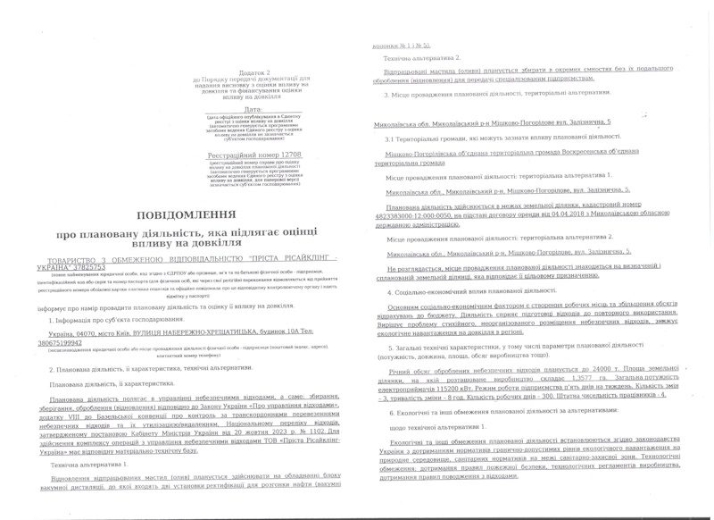 Департамент екологічної оцінки Міністерства захисту довкілля та природних ресурсів України повідомляє, що 05.05.2025 відповідно до вимог Закону України “Про оцінку впливу на довкілля” ТОВ “ПРІСТА РІСАЙКЛІНГ-УКРАЇНА” розпочато процедуру оцінки впливу на довкілля шляхом розміщення в Єдиному реєстрі з оцінки впливу на довкілля повідомлення про плановану діяльність, яка підлягає оцінці впливу на довкілля, стосовно планованої діяльності з управління небезпечними відходами, а саме: збирання, зберігання, оброблення (відновлення).