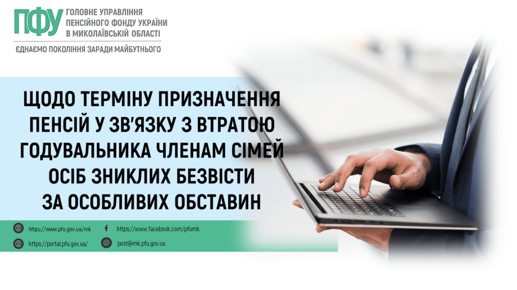 Відповідно до ст. 36 Закону України від 09.07.2003 № 1058-IV “Про загальнообов’язкове державне пенсійне страхування” (далі – Закон № 1058) пенсія у зв’язку з втратою годувальника призначається, зокрема, непрацездатним членам сім’ї особи, якій відповідно до Закону України від 12.07.2018 № 2505-VII (із змінами від 14.04.2022 № 2191-IX) “Про правовий статус осіб, зниклих безвісти за особливих обставин” (далі – Закон № 2505) надано правовий статус особи, зниклої безвісти за особливих обставин, – незалежно від тривалості страхового стажу. При цьому дітям пенсія у зв’язку з втратою годувальника призначається незалежно від того, чи були вони на утриманні годувальника.