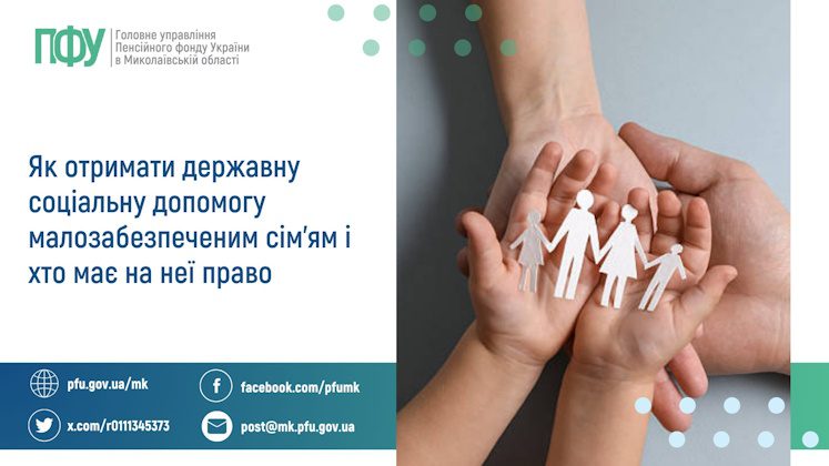 Звернутись за оформленням державної соціальної допомоги малозабезпеченим сім’ям можна як онлайн – через вебпортал електронних послуг Пенсійного фонду України (portal.pfu.gov.ua – за технічної можливості) або портал «Дія», так і особисто – до уповноважених осіб виконавчого органу сільської, селищної, міської ради відповідної територіальної громади; ЦНАП, сервісних центрів Пенсійного фонду України.