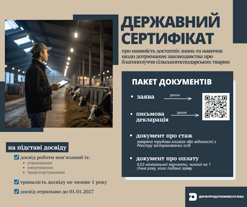 1 січня 2026 року в Україні запроваджуються обов’язкові вимоги щодо благополуччя сільськогосподарських тварин. Всі, хто працює з тваринами — утримує, перевозить, здійснює забій або виконує інші пов’язані роботи — повинні мати державний сертифікат, який підтверджує знання та практичні навички.