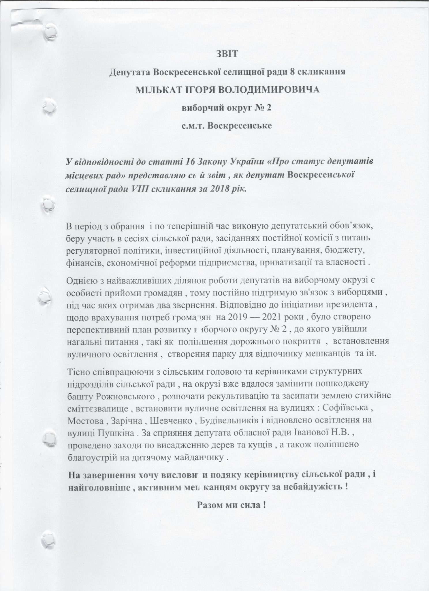 ЗВІТ Депутата Воскресенської селищної ради 8 скликання по виборчому окрузі № 2  (смт Воскресенське) МІЛЬКАТ ІГОРЯ ВОЛОДИМИРОВИЧА