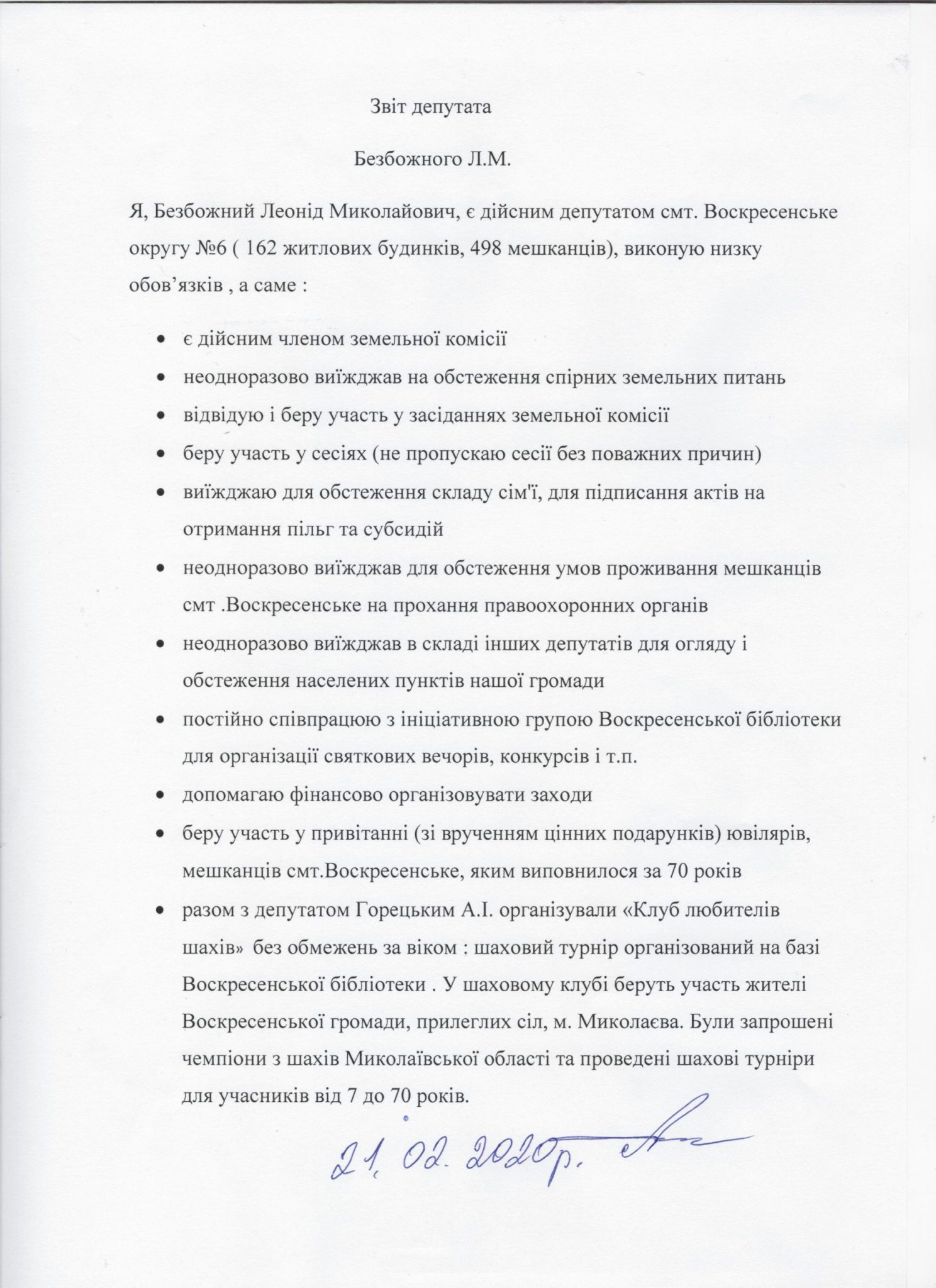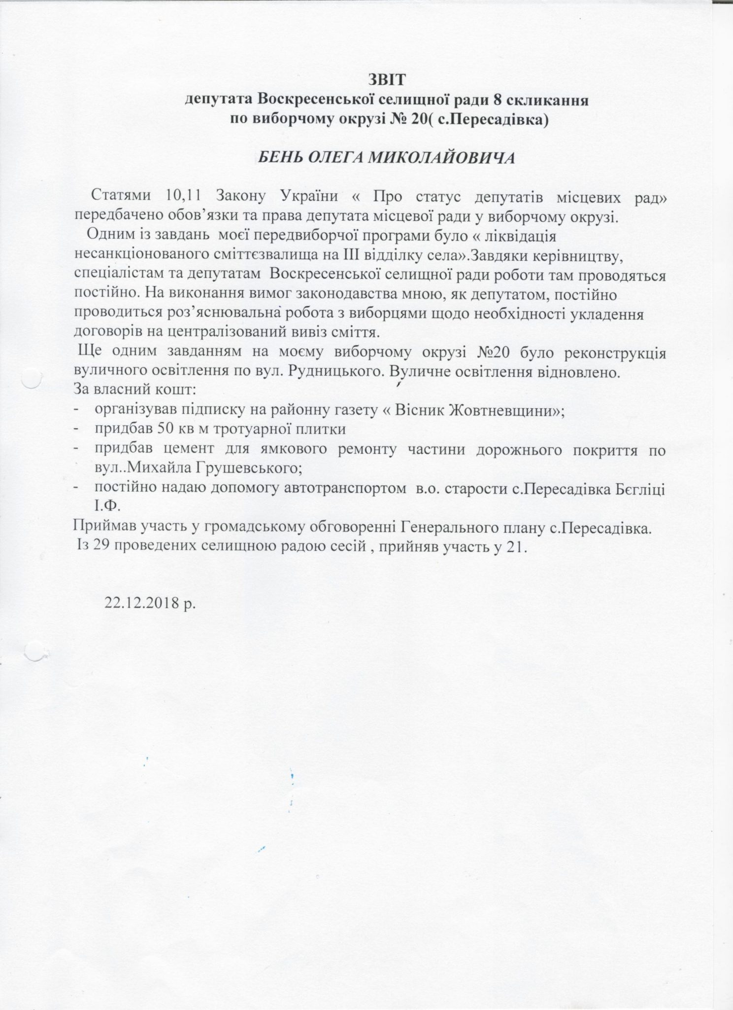 ЗВІТ депутата Воскресенської селищної ради 8 скликання по виборчому окрузі № 25 БУЛКІНА СЕРГІЯ СЕРГІЙОВИЧА